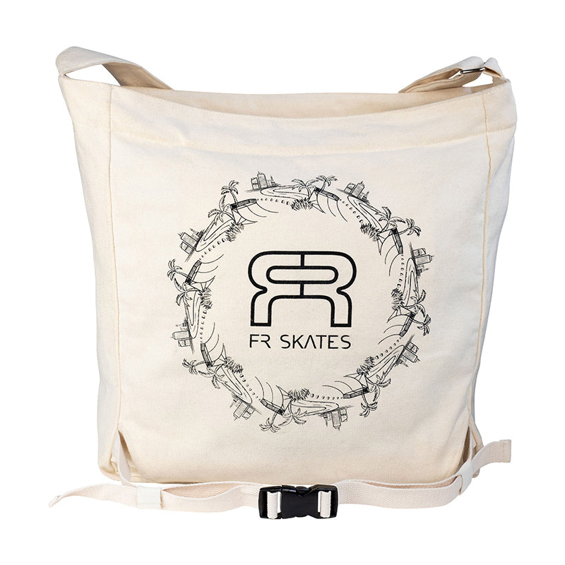 The FR Tote Bag is available in Blue or Natural colors. It features a secure zipper closure. The adjustable carry rope ensures comfortable handling. It includes a belt that can be attached while skating to fix the bag in place and prevent swinging. The FR Tote Bag is spacious enough to fit a pair of skates.