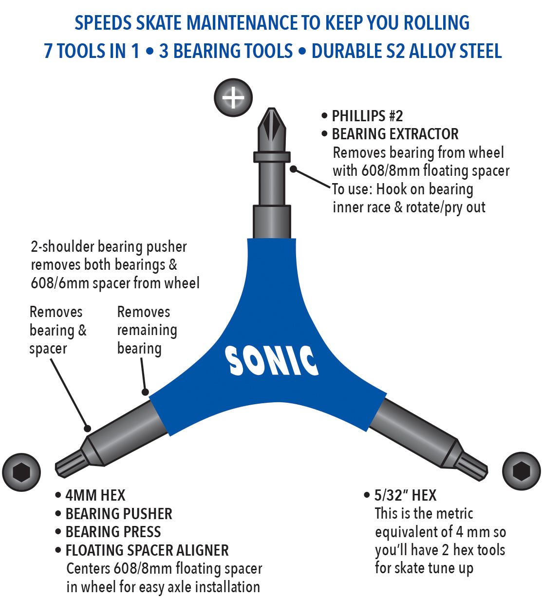 PROFESSIONAL GRADE SKATE TOOL HAS A LARGE HANDLE FOR FAST & EASY SKATE MAINTENANCE