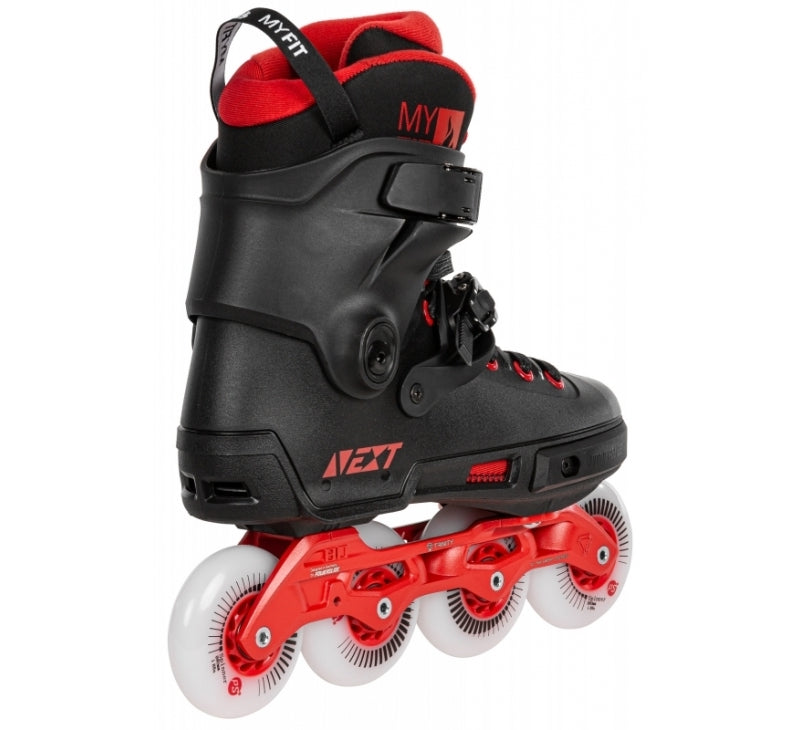 Mounted to the boot are the light and rigid Elite cast aluminum frames that have been proven to be an excellent frame for urban skating. The Elite frame now matches your shoe sizes. We deliver the skate with the 243mm/4x80mm setup for size 36-43, and from size 44 up the skate is equipped with a 275mm/4x90mm frame enabling you to upgrade your Next 80 to a Next 90! Riding on fast and grippy 4x80mm Spinner wheels and super-smooth WICKED ABEC 9 bearings, you get a fast, intense ride every time. Our mission with the POWERSLIDE NEXT Black Red 80 was to reach the perfect balance of performance, quality, and comfort in a hard boot urban inline skate.