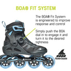 The Macroblade 84 BOA® combines Rollerblade® craftmanship, comfort and performance resulting in an enhanced entry-level skate with high-quality support, performance and convenience. The higher cuff allows extra stability for balance control, the liner is pure comfort with padding in the tongue and ankle areas to provide sock-like comfort and lateral support. The BOA® Fit System delivers a micro-adjustable precision fit that can be obtained fast and effortlessly with just turning the dial and the Footboard Sizer provides two sizes in one skate. It enables skaters to insert the Footboard under the insole to create a snugger, more performance fit or remove it to accommodate the bigger size for more room in their skates. The aluminum frame design keeps you closer to the ground and improves performance by adding more power transfer and durability. 84mm Performance wheels with SG7 bearings add a little speed when engaged. Macroblade 84 BOA® makes an ideal upgrade or first time skate with quality components and enhanced fit and support features