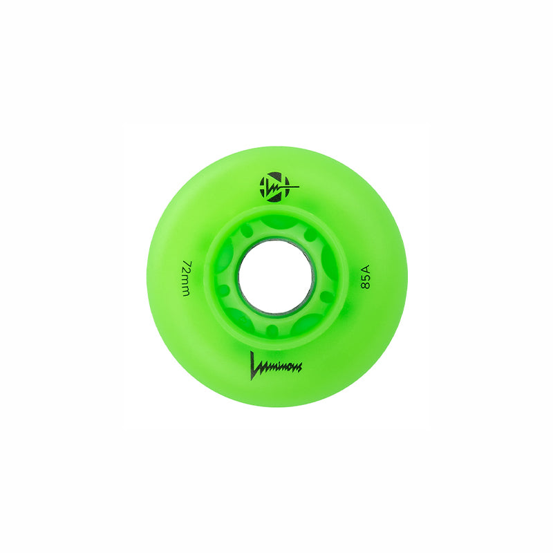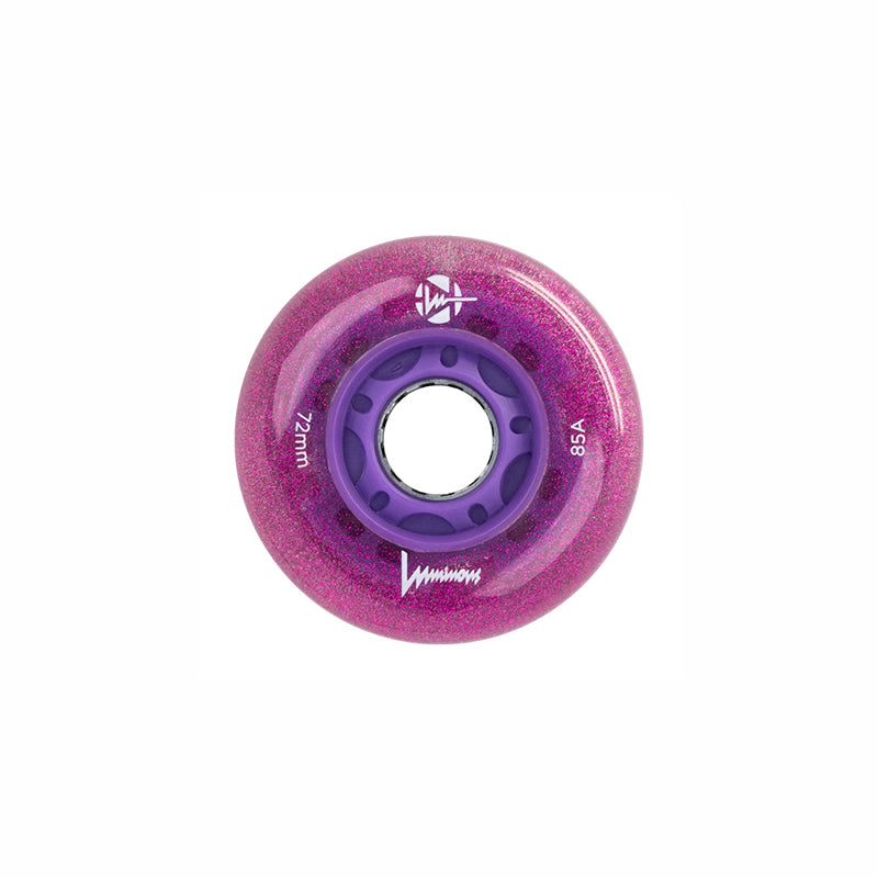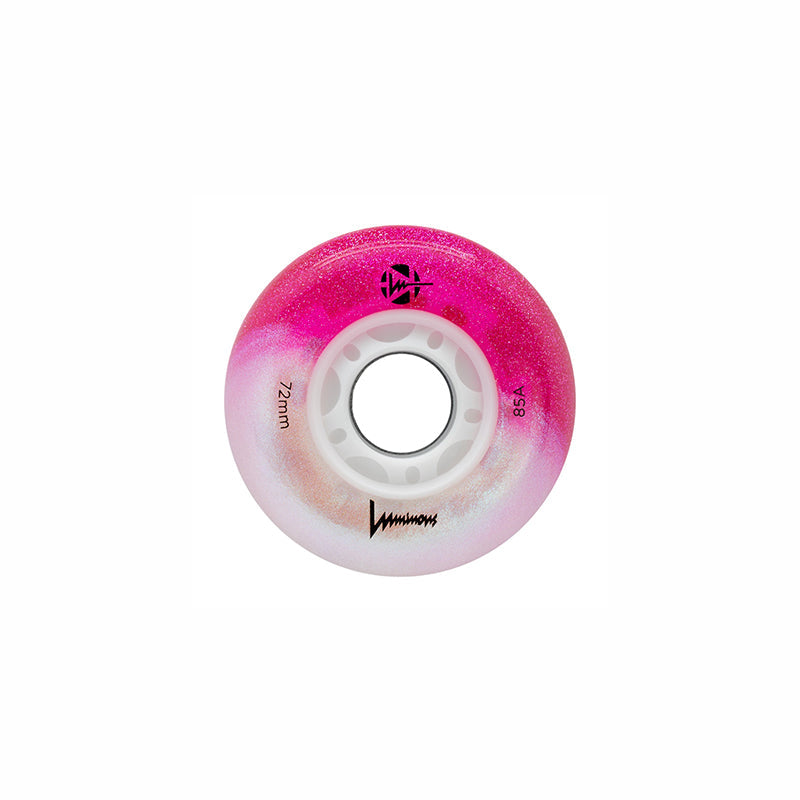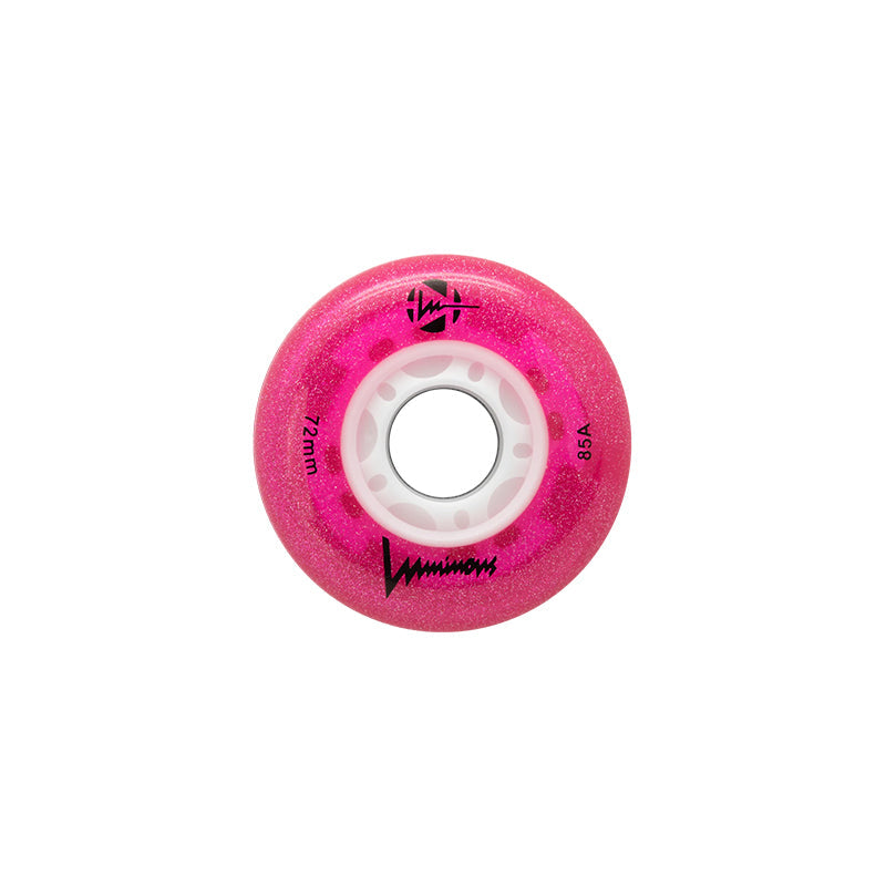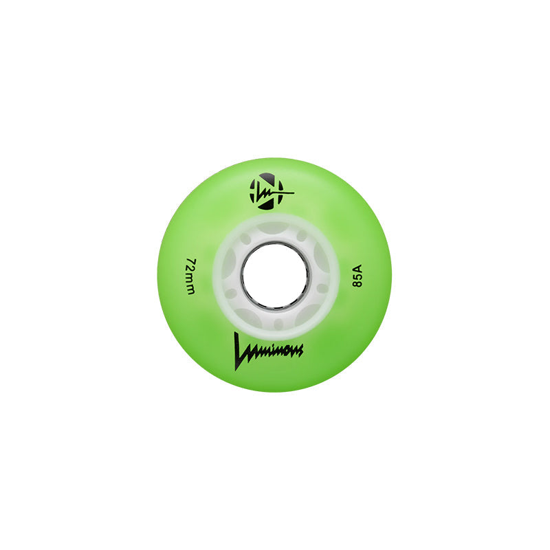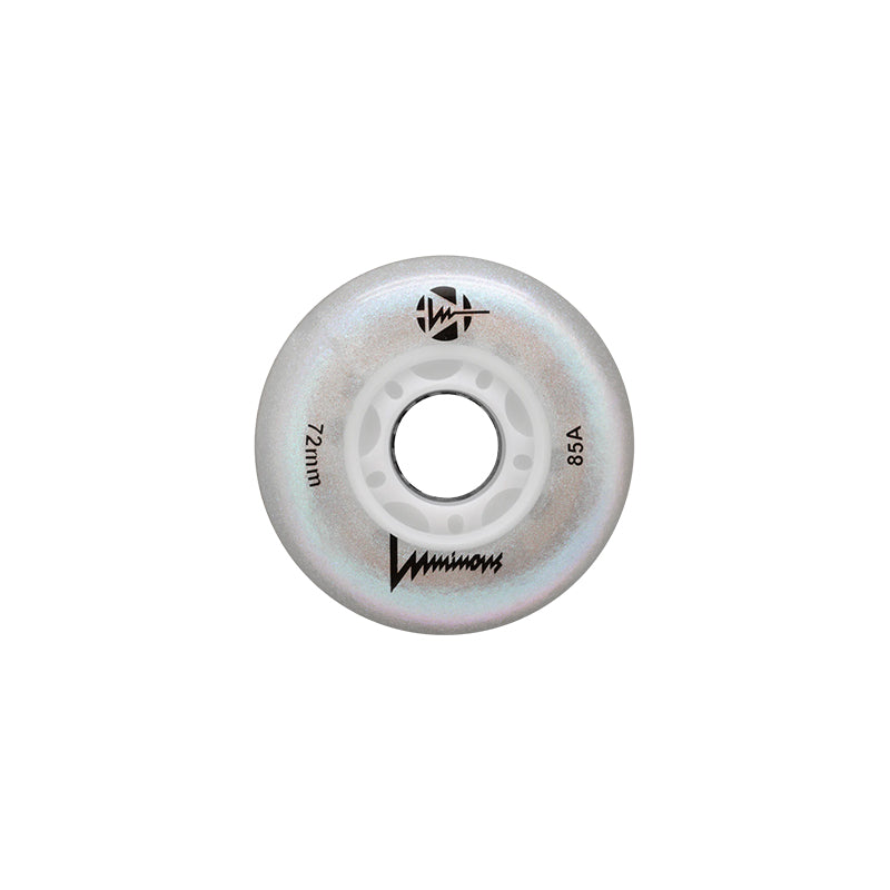 Luminous wheels are powered by a magnetic bearing spacer in the core of the wheel. When you roll the wheel lights up, no charging necessary. Colors labeled "Glow" also glow in the dark. Sold in packs of four.
