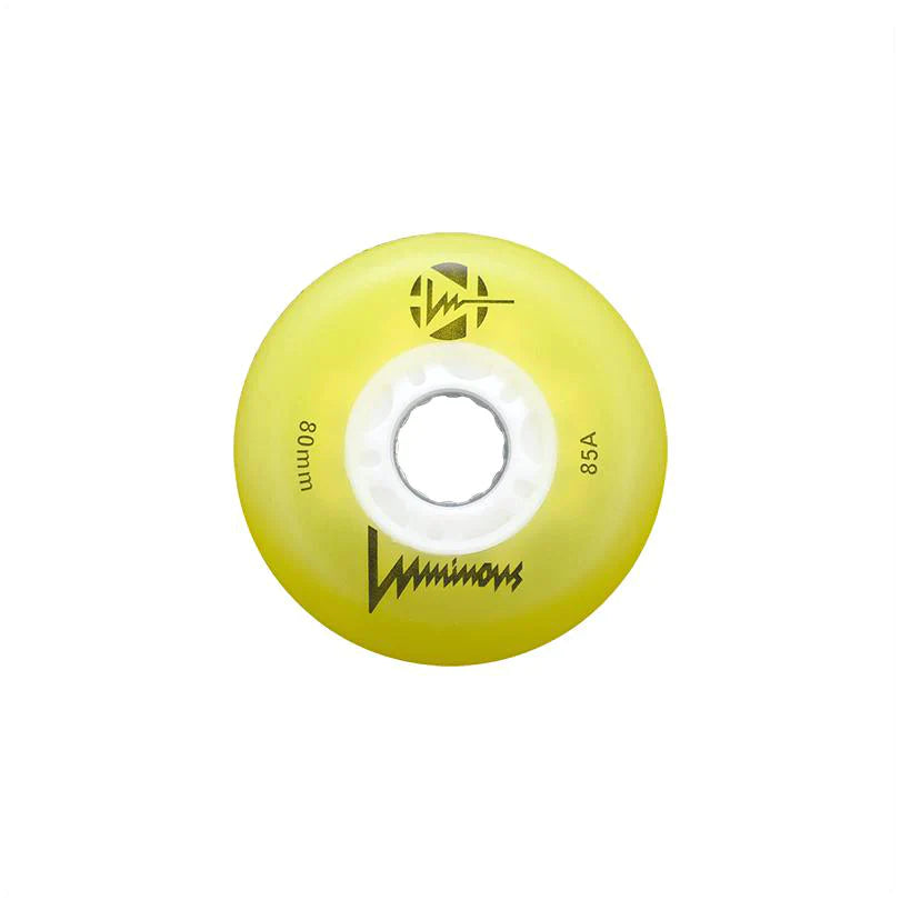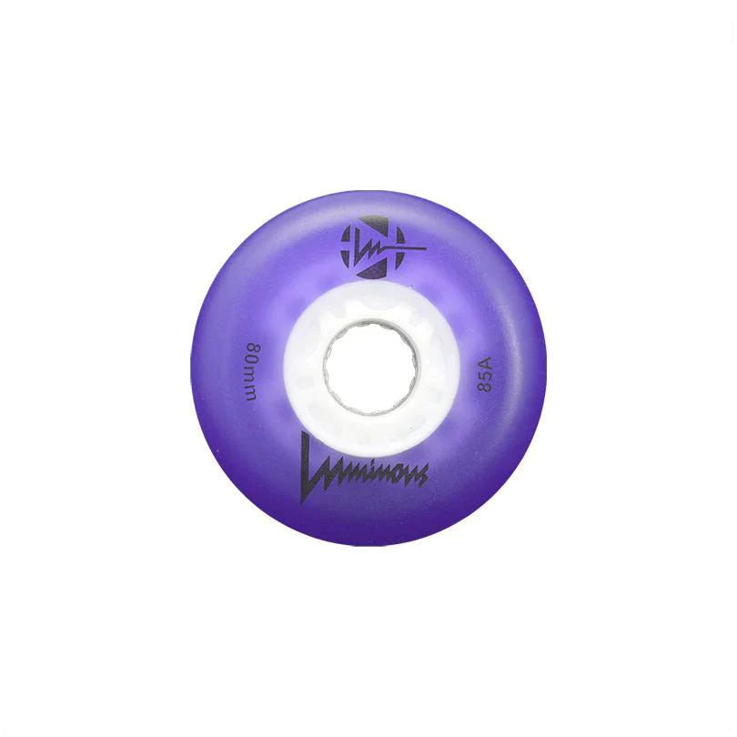 Luminous wheels are powered by a magnetic bearing spacer in the core of the wheel. When you roll the wheel lights up, no charging necessary. Colors labeled "Glow" also glow in the dark. Sold in sets of four.