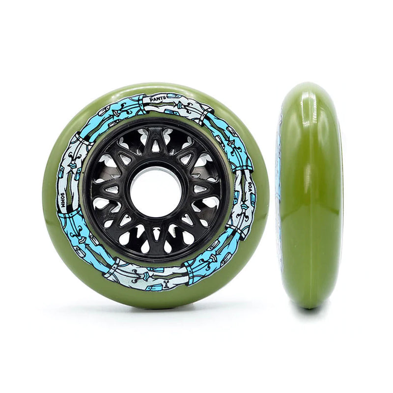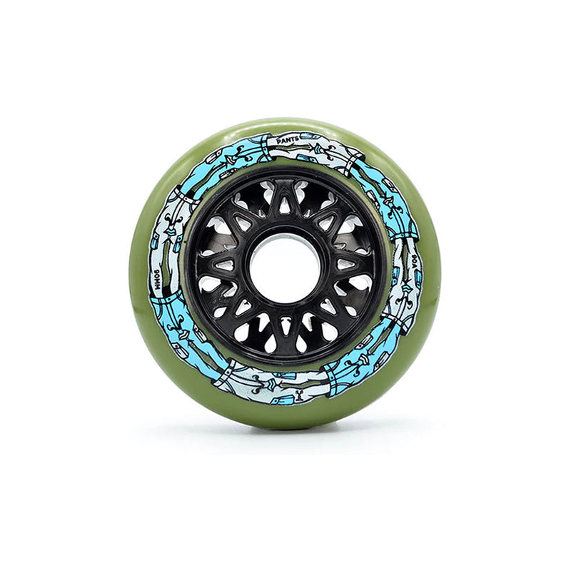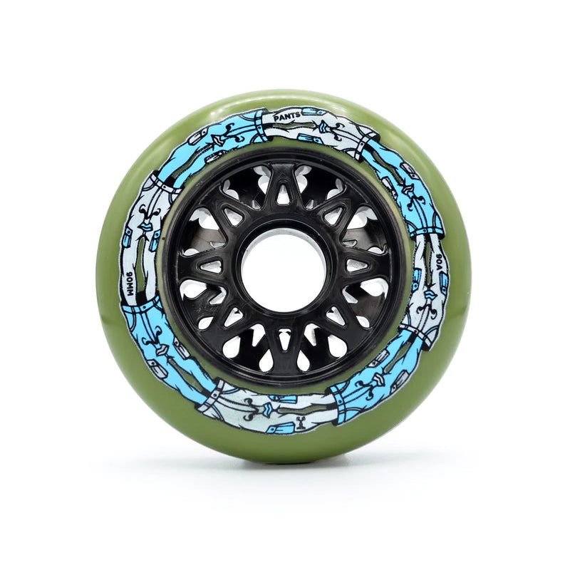"The MB Pants are a wheel size used for a unique mix of slalom, speed, aggressive and freeskating. This size became MB canon when the very first NR90 Wizard Frame was created in 2014. Leon Basin's BIG WHEELS 2 section dropped and completely changed what big wheel skating could be (if you know, you know). Used heavily in the Wizard Frame Testing series, ZONE, MB7 and MB8. These wheels are playful, fun, definitely not core (unless you're skating them on Sola frames), and a 90a hardness for longer lasting street riding and sliding. This is basically Todd's pro wheel because he's like... really good on them."